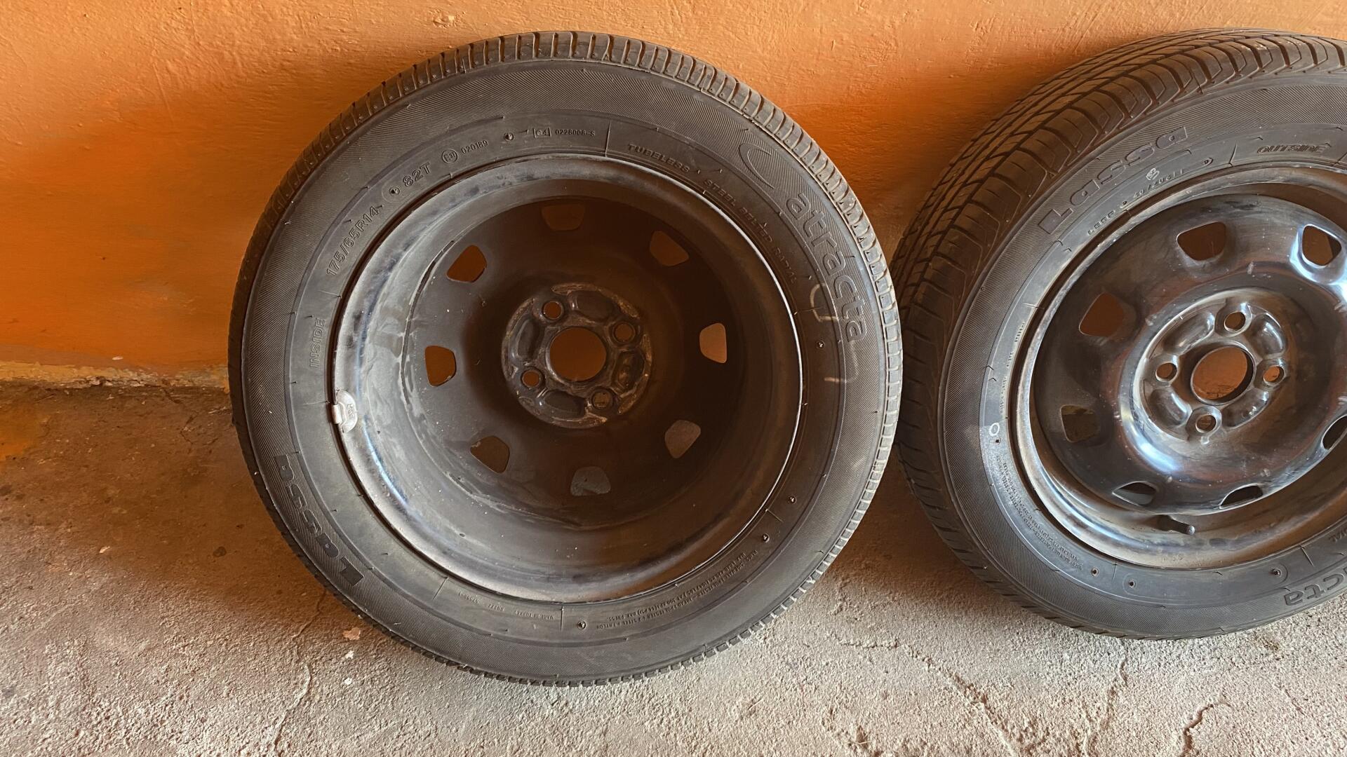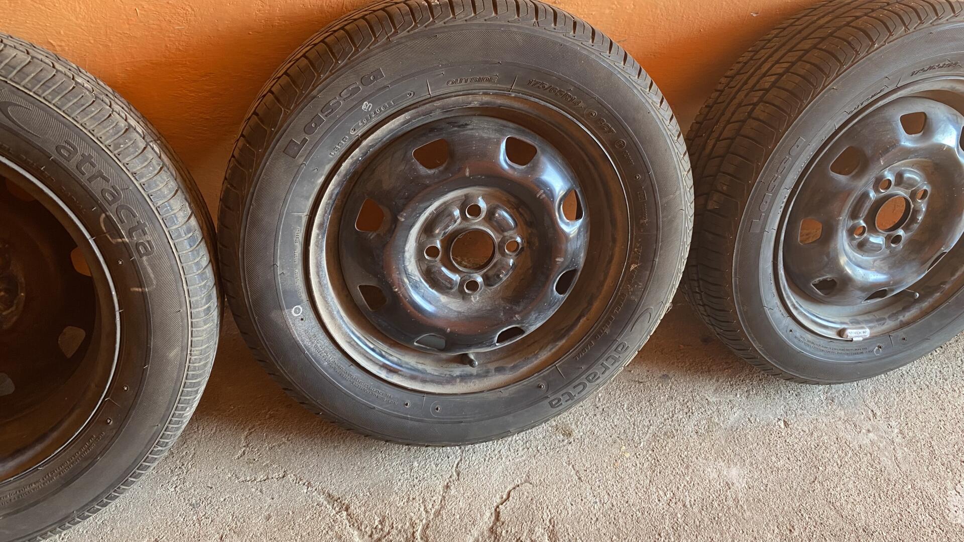 Witam. Sprzedam 4 felgi stalowe. Stan widoczny na zdjęciach. W cenie felg dorzucam komplet opon LASSA ATRACTA 175/65/R14 DOT 4072 0611