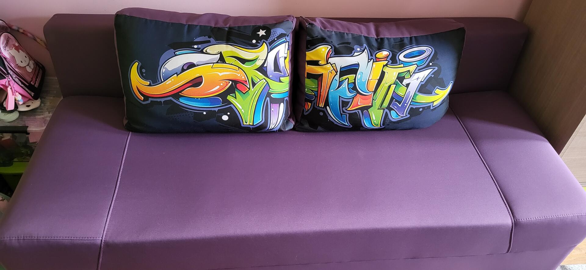 Wygodna, rozkładana kanapa w fioletowym kolorze. Na poduszkach widoczne są kolorowe graffiti, nadające meblowi ciekawego, miejskiego stylu. Łóżko jest używane, ale w bardzo dobrym stanie. Po rozłożeniu 140x195.