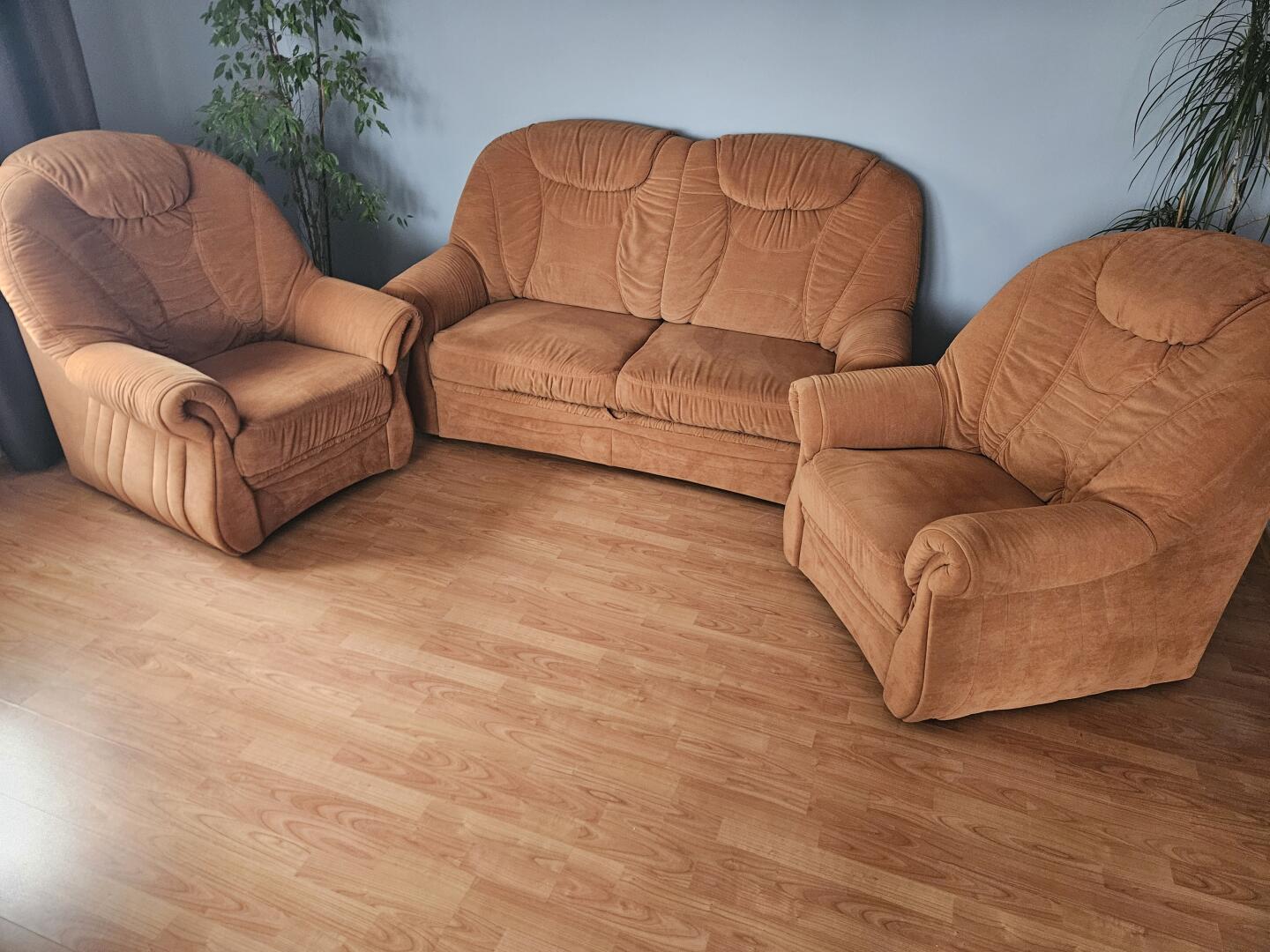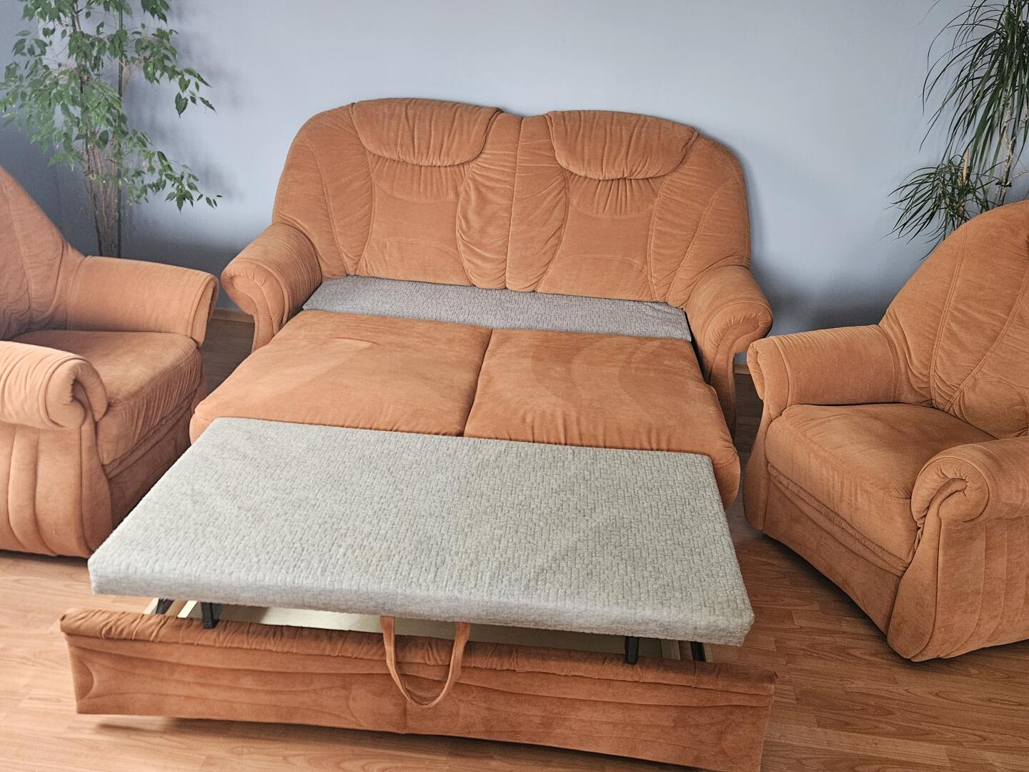 Sprzedam sofę 3-osobową z funkcją spania i pojemnikiem na pościel z dwoma fotelami. Zestaw w bardzo dobrym stanie. Wymiar sofy 180x90 a po rozłożeniu 180x240 a foteli 90x90. Odbiór osobisty.