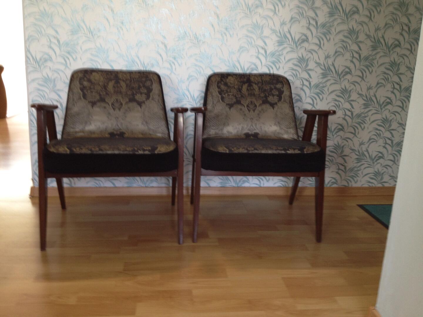 Fotele są po renowacji . Stan bardzo dobry. Oparcia drewniane w kolorze ciemnego brązu. Siedziska materiałowe w kolorze czarno-zielono-złote. Odbiór własnym transportem. Polecam.